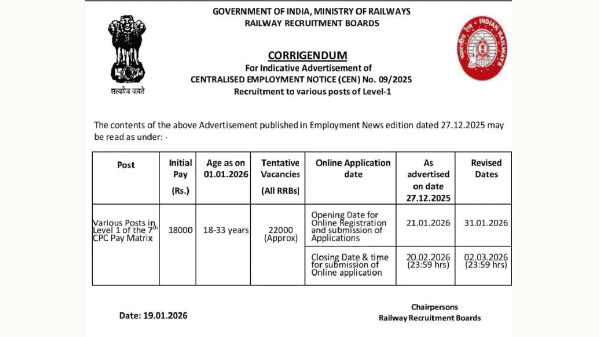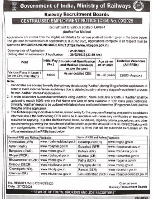 RRB Group D Recruitment 2026 for 10th Pass, ITI Freshers : Total 22000 Vacancies for Level 1 in Indian Railways, Fill Online Application, Apply @www.indianrailways.gov.in